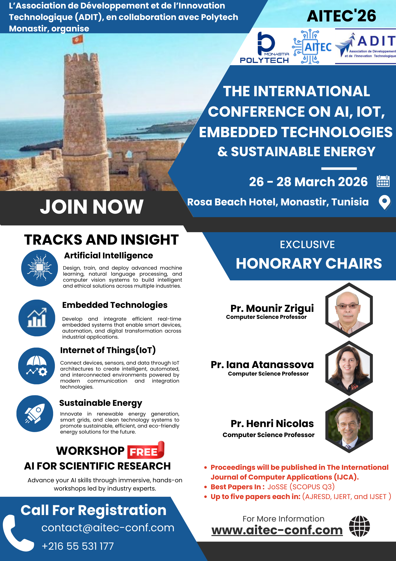 La PolyTech Monastir, en collaboration avec l’Association de Développement et de l’Innovation Technologique (ADIT), a le plaisir d’annoncer la conférence internationale AITEC’26 🚀 :