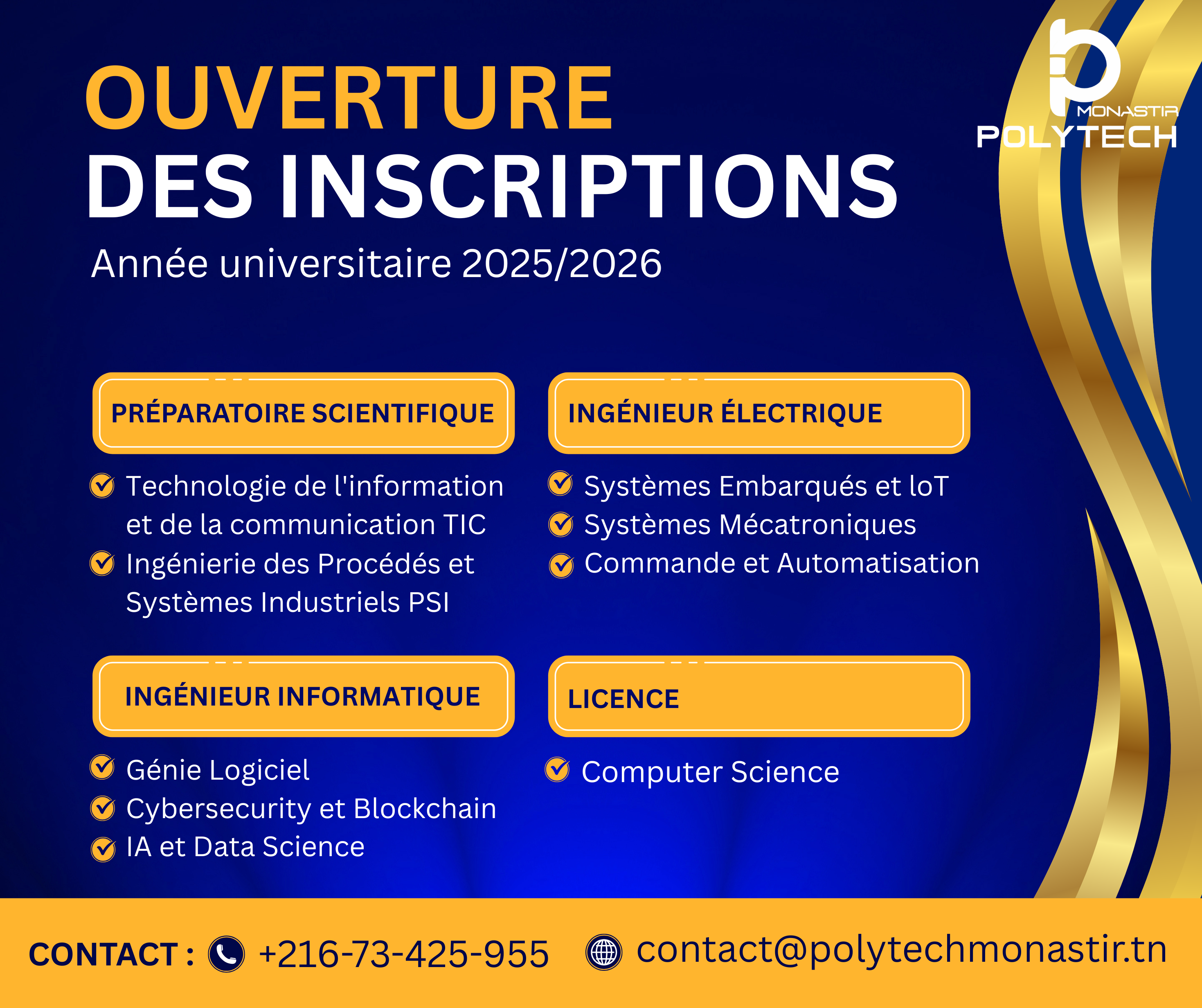 Visitez notre site web ou contactez-nous au 73 425 955 / contact@polytechmonastir.com